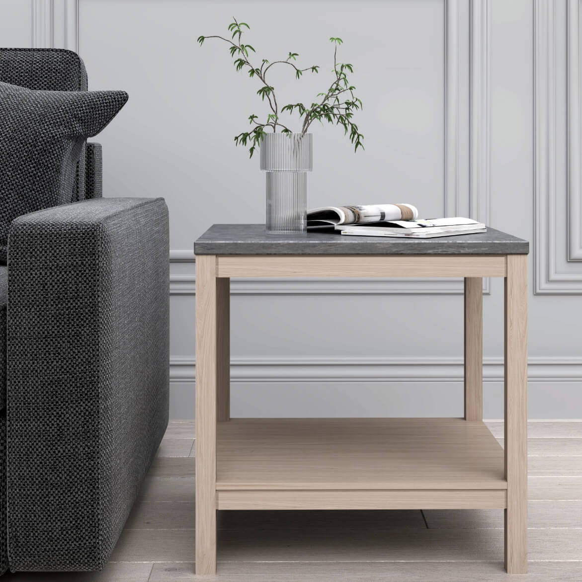 Side table in ash, oak and smoked oak with table top in Swedish limestone